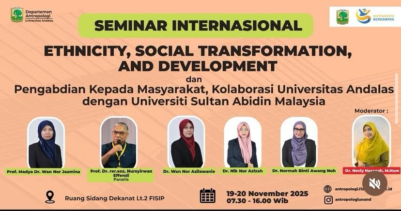Departemen Antropologi Sosial Fakultas Ilmu Sosial dan Ilmu Politik (FISIP) Universitas Andalas menyelenggarakan Seminar Internasional Antropologi yang mengangkat tema “Ethnicity, Social Transformation, and Development” pada 19–20 November 2025. Kegiatan ini berlangsung di Ruang Sidang Dekanat Lantai 2 FISIP Universitas Andalas, mulai pukul 07.30 hingga 16.00 WIB, dan menjadi bagian dari agenda akademik berskala internasional yang mengintegrasikan seminar ilmiah dengan kegiatan Pengabdian kepada Masyarakat.