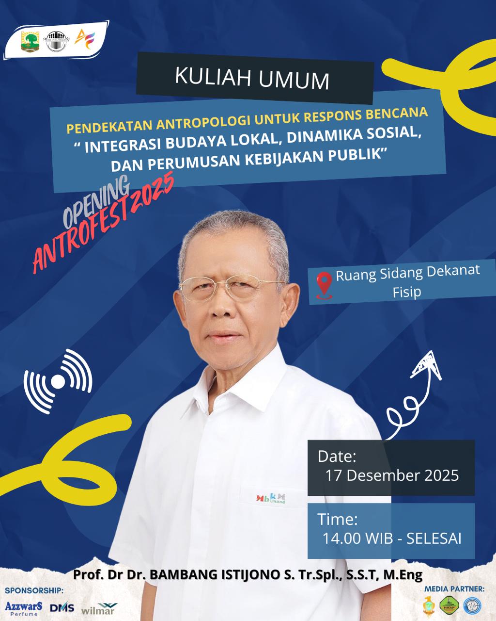 Bencana alam sering kali dipandang hanya dari sudut pandang teknis, angka-angka kerugian, dan rekayasa infrastruktur. Namun, di balik itu semua, ada dinamika manusia yang jauh lebih kompleks. Membuka rangkaian acara Opening Antrofest 2025, Departemen Antropologi menyelenggarakan Kuliah Umum bertajuk "Pendekatan Antropologi untuk Respon Bencana: Integrasi Budaya Lokal, Dinamika Sosial, dan Perumusan Kebijakan Publik" pada Rabu, 17 Desember 2025.