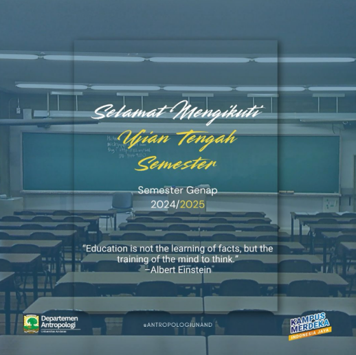 Universitas Andalas, khususnya Departemen Antropologi, menyampaikan selamat dan semangat kepada seluruh mahasiswa dalam menghadapi Ujian Tengah Semester (UTS) Genap Tahun Akademik 2024/2025. Momen ini merupakan salah satu tahapan penting dalam proses pembelajaran di perguruan tinggi yang bertujuan untuk mengevaluasi capaian pembelajaran mahasiswa selama setengah semester berlangsung.