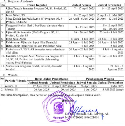 Universitas Andalas secara resmi mengumumkan perubahan pada kalender akademik tahun 2025. Penyesuaian ini mencakup berbagai kegiatan penting, baik akademik maupun pelaksanaan wisuda. Melalui surat edaran yang ditandatangani oleh Rektor Universitas Andalas, Dr. Efa Yonnedi, S.E., MPPM., Ak., perubahan ini ditujukan kepada seluruh civitas akademika untuk memastikan kelancaran proses pendidikan serta penyesuaian terhadap dinamika yang terjadi di lingkungan universitas.