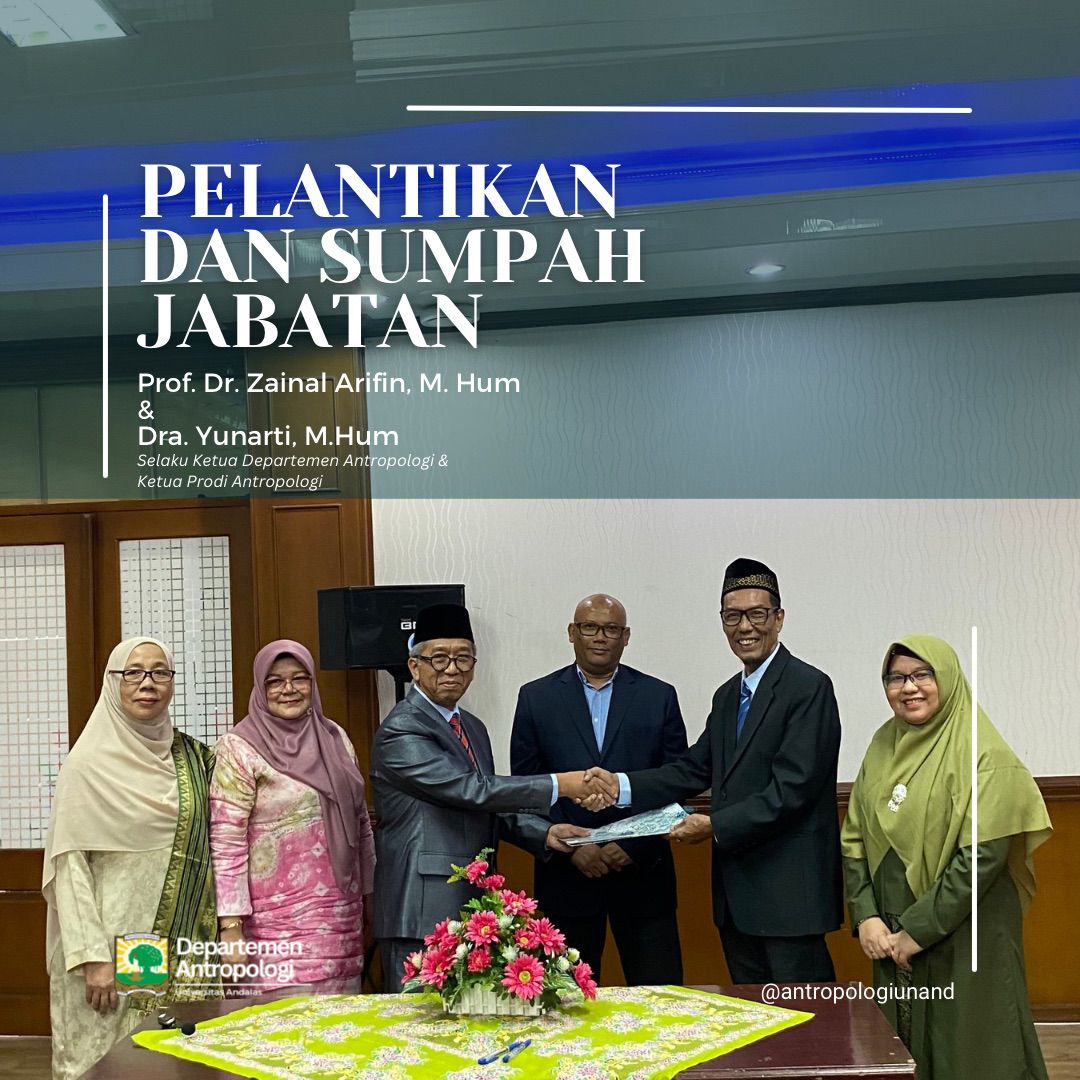 Pada tanggal 4 November 2024, Fakultas Ilmu Sosial dan Ilmu Politik (FISIP) Universitas Andalas (Unand) menyelenggarakan acara penting, yaitu pelantikan dan pengambilan sumpah jabatan bagi dua pejabat baru di Departemen Antropologi. Prof. Dr. Zainal Arifin, M. Hum., dilantik sebagai Ketua Departemen Antropologi yang baru, sementara Ibu Dra. Yunarti, M. Hum., resmi menjabat sebagai Ketua Program Studi S1 Departemen Antropologi. Acara ini juga memberikan penghargaan dan ucapan terima kasih kepada Bapak Sidarta Pujiraharjo, S. Sos., M. Hum., yang sebelumnya menjabat sebagai Pelaksana Tugas (PLT) Ketua Departemen Antropologi.